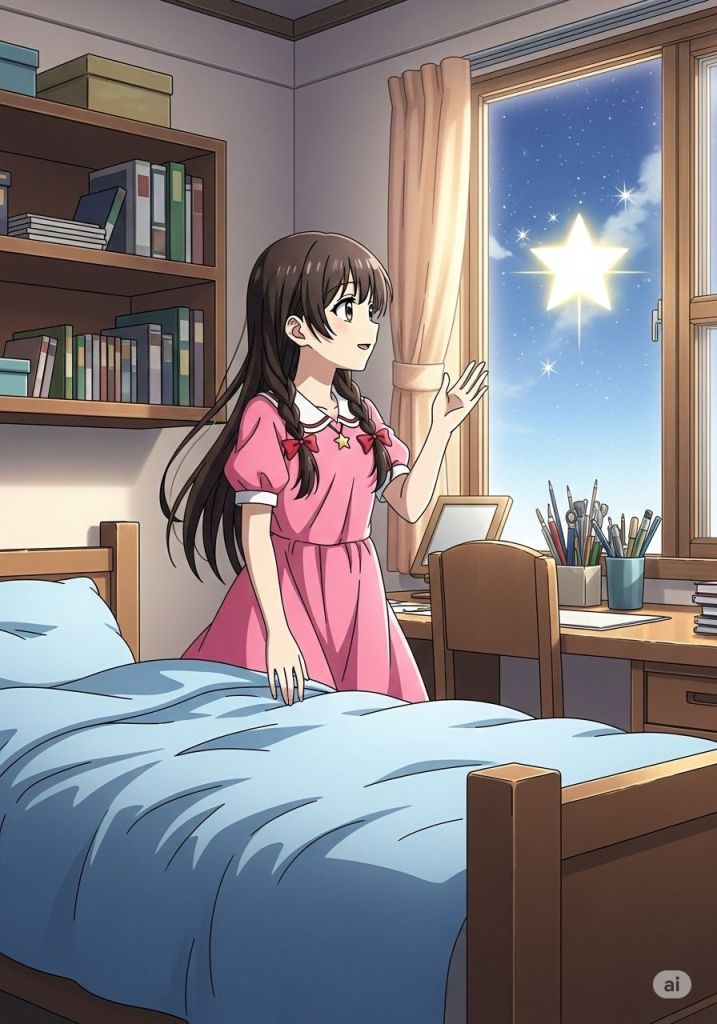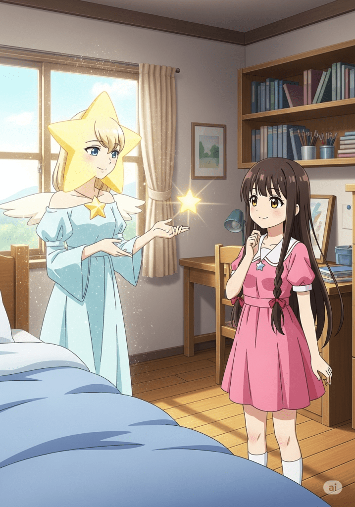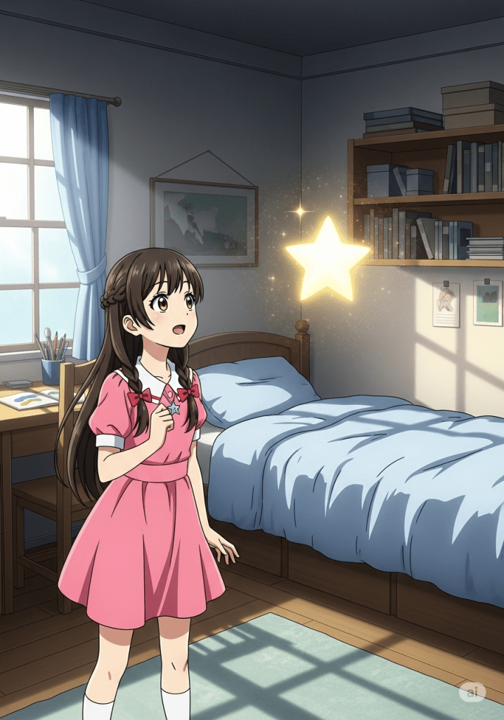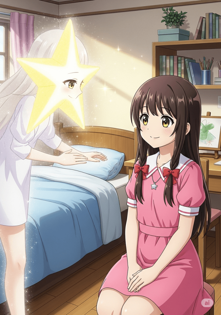Akari nodded, a new understanding dawning in her heart. “So, if I’m humble and collaborate, I won’t feel so… hollow?” she asked. Hoshi twinkled. “Exactly! Your light will mix with others, creating something truly magnificent. Go, Akari, share your light!” With a gentle shimmer, Hoshi floated back out the window, becoming just a bright star once more.