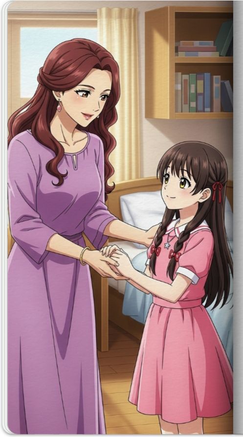 That evening, Akari’s mother, Kazumi, noticed her daughter’s quiet mood. “Is everything alright, my little star?” she asked gently, stroking Akari’s hair. Akari just sighed, looking out the window.